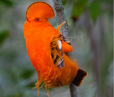 Julieth lleva puesto un vestido lindísimo para el baile de su escuela, coloca música y frente al espejo intenta bailar y dar giros y tropieza repetidamente, se rinde no cree poder hacerlo sola, y piensa habrá en el libro algún amigo emplumado bailarín? Abre el libro y ve al gallito de las rocas.